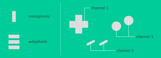 - Monophonic or 3 channel polyphonic.