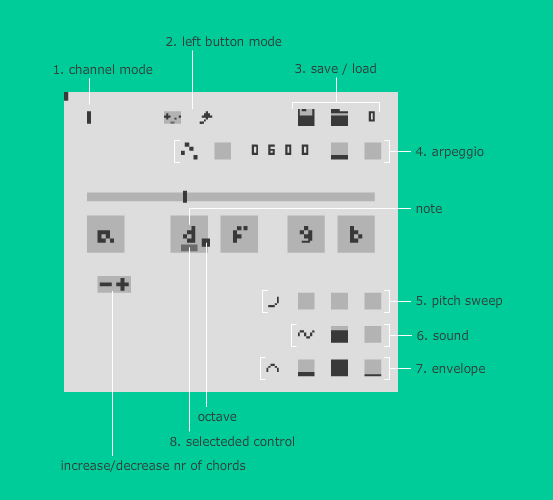 You build "chords" of five notes and play them back using the pulse wave channel, with full sound register settings control and optional arpeggiator.