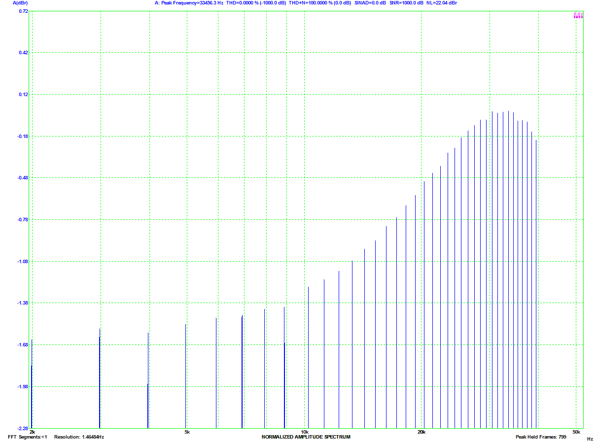 Captured at the output, this curve shows that the frequency response peaks at about +1,6 dB at 30 kHz, and is up by over 1 dB at 20 kHz.