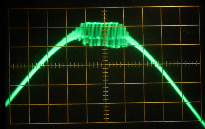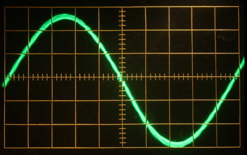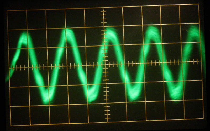 Scope view of a 20 kHz sine wave at 5 W into 8 Ohm. The HF noise can be seen as the abnormal thickness of the trace.