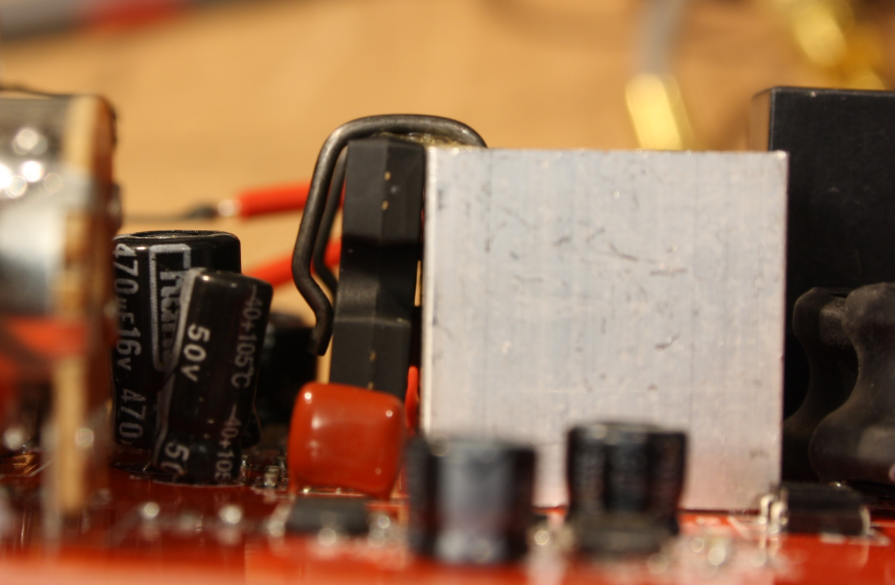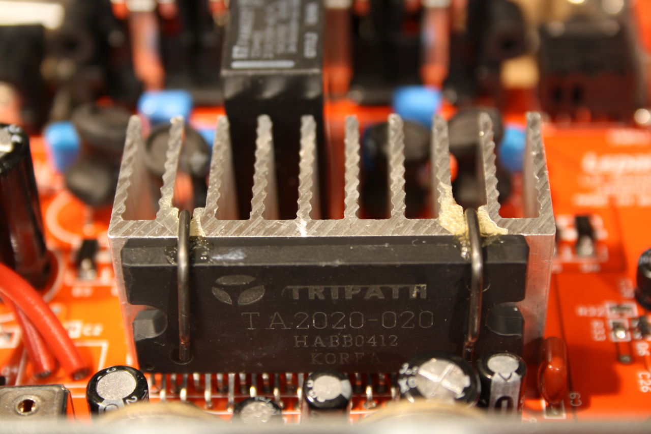 Yes, there was an almost millimetre-thick gap between the chip and the heat sink! The over-temperature protection would kick in after a few minutes of heavy 4-Ohm loading. Thanks to the efficiency of the TA2020-020, this would probably not have been noticeable in every-day use. However, one must wonder what it does to the chip lifespan.