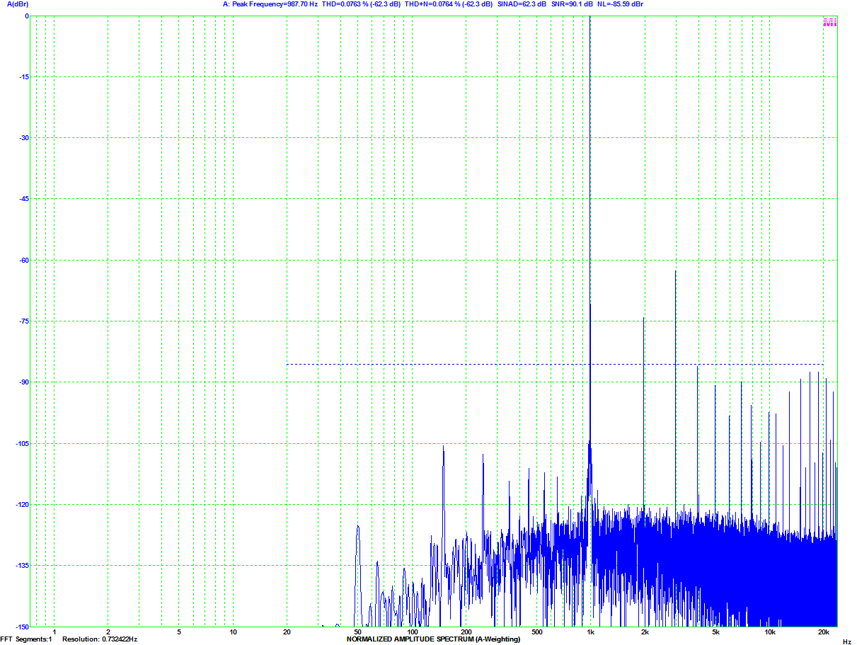 It does however far surpass its specification of 80 dB SNR, measuring in at 90,1 dB A-weighted and 87 dB unweighed from 20 Hz to 20 kHz.
