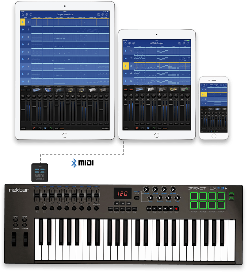 Pair USB MIDI devices wirelessly with your iOS/MacOS device using one (1) WIDI Uhost unit. Add a secondary WIDI Uhost to bypass limitations of built-in Bluetooth of your Apple device.